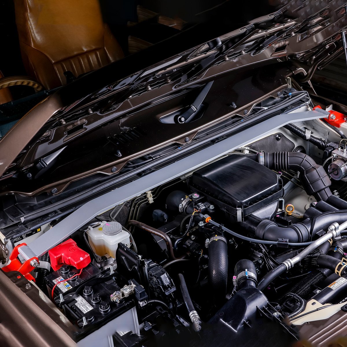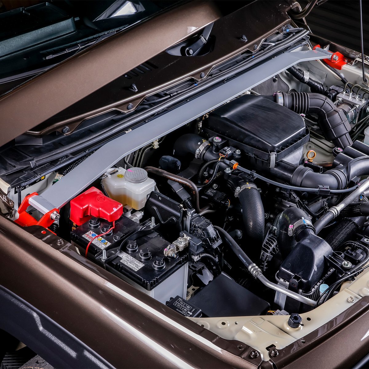 フロントストラット上部を連結し、ボディ剛性を高める**補強パーツ(タワーバー)**です。オフロード走行や高速走行時に発生するボディのねじれを抑制し、ハンドリングの安定性を向上させます。